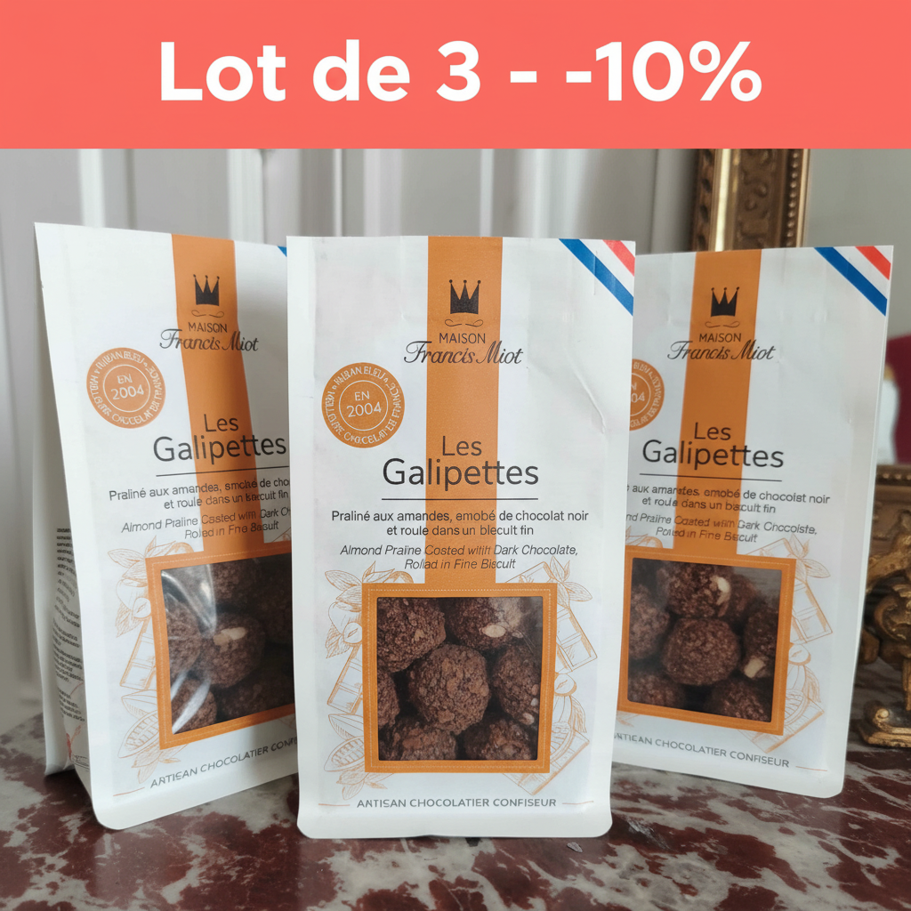 Offrez-vous le plaisir de savourer les légendaires Galipettes de Francis Miot, récompensées d'un Ruban Bleu – Meilleur Chocolat de France. Ce lot de 3 sachets est parfait pour les amateurs de confiseries artisanales ou pour un cadeau gourmand inoubliable.