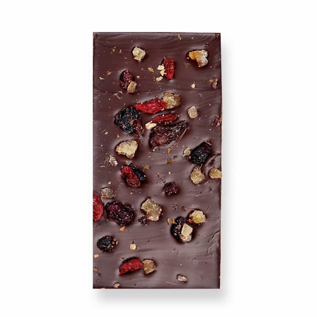 Offrez-vous un voyage gourmand de sensations : une tablette noire à 70 % de cacao du Pérou bio, façonnée en méthode bean-to-bar par le maître chocolatier et Meilleur Ouvrier de France Alain Chartier, agrémentée de baies de goji, cranberries, dés de gingembre et poivre de Timut — un mélange audacieux qui éveille les sens et sublime l’instant.